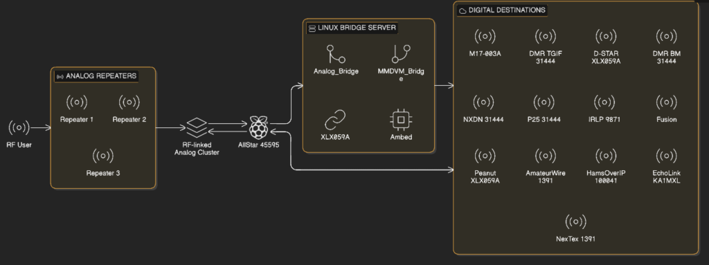 Incoming audio from DMR 31444, XLX059A, M17‑003A, Fusion, P25, NXDN, IRLP 9871, Peanut, EchoLink KA1MXL, HamsOverIP, AmateurWire, and NexTex is decoded on the bridge server. That analog audio is sent back to the AllStar hub node 45595, which keys the RF‑linked analog repeater cluster so analog users hear everything and can talk back into all of those systems.